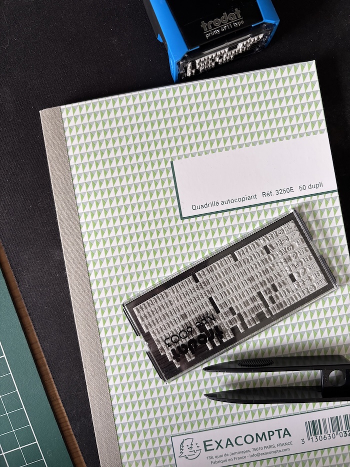 Et j’aimerais vous présenter le résultat final, mais ce modus operandi m’a fait réaliser que j’ai peut-être un problème de vue, car à chaque fois que je me concentre pour agencer les lettres sur le tampon personnalisable, je récolte un migraine oculaire. C’est un truc qui a commencé quand j’ai voulu calligraphier les noms des invités du mariage de ma sœur sur des enveloppes : chaque minute passée à me concentrer sur les lettres à former augmentait la probabilité d’une migraine ophtalmique. Idem avec le tamponnage, et maintenant idem même avec l’écriture manuscrite « soignée ». Si j’écris dans mon journal intime, je ne prête pas du tout attention à la lisibilité de mon écriture, donc no problem. Mais dans le zine, j’écris soigneusement pour pouvoir être lue, et hop, migraine.