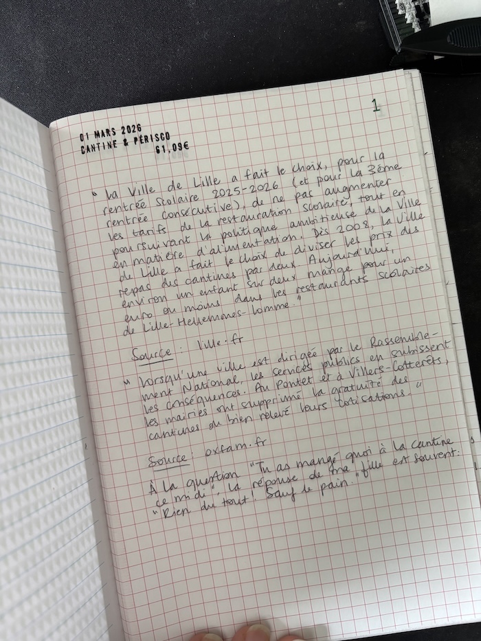 Le mois prochain, je me concentre sur une création audio, mais je continuerai de répertorier mes achats : il y a 50 pages dans mon cahier, autant les remplir toutes. Avec un peu plus de temps, que j’utiliserai aussi pour tenter d’aller à la racine de mon problème de vue, peut-être que mes conclusions à la fin de cette expérience éthique et artistique seront encore plus intéressantes. D’autant plus qu’en avril, mon amie Nathalie lance le projet « Mon flouze pour les zouz », qui viendra forcément colorer mes réflexions.